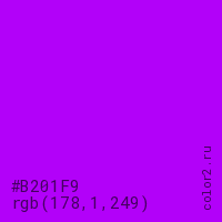 Цвет #B201F9 в цветовой модели RGB обозначается тремя октетами (178, 1, 249) в десятичном формате и #B201F9 в шестнадцатиричном (hex) формате, которые являются интенсивностью красного 178 (hex B2), интенсивность зелёного 1 (hex 01) и интенсивность синего 249 (hex F9).