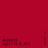 Цвет #B20329 в цветовой модели RGB обозначается тремя октетами (178, 3, 41) в десятичном формате и #B20329 в шестнадцатиричном (hex) формате, которые являются интенсивностью красного 178 (hex B2), интенсивность зелёного 3 (hex 03) и интенсивность синего 41 (hex 29).
