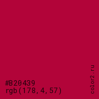Цвет #B20439 в цветовой модели RGB обозначается тремя октетами (178, 4, 57) в десятичном формате и #B20439 в шестнадцатиричном (hex) формате, которые являются интенсивностью красного 178 (hex B2), интенсивность зелёного 4 (hex 04) и интенсивность синего 57 (hex 39).