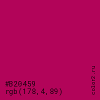 Цвет #B20459 в цветовой модели RGB обозначается тремя октетами (178, 4, 89) в десятичном формате и #B20459 в шестнадцатиричном (hex) формате, которые являются интенсивностью красного 178 (hex B2), интенсивность зелёного 4 (hex 04) и интенсивность синего 89 (hex 59).