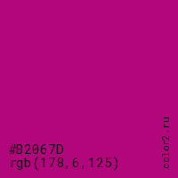 Цвет #B2067D в цветовой модели RGB обозначается тремя октетами (178, 6, 125) в десятичном формате и #B2067D в шестнадцатиричном (hex) формате, которые являются интенсивностью красного 178 (hex B2), интенсивность зелёного 6 (hex 06) и интенсивность синего 125 (hex 7D).