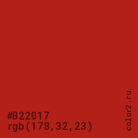 Цвет #B22017 в цветовой модели RGB обозначается тремя октетами (178, 32, 23) в десятичном формате и #B22017 в шестнадцатиричном (hex) формате, которые являются интенсивностью красного 178 (hex B2), интенсивность зелёного 32 (hex 20) и интенсивность синего 23 (hex 17).