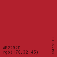 Цвет #B2202D в цветовой модели RGB обозначается тремя октетами (178, 32, 45) в десятичном формате и #B2202D в шестнадцатиричном (hex) формате, которые являются интенсивностью красного 178 (hex B2), интенсивность зелёного 32 (hex 20) и интенсивность синего 45 (hex 2D).