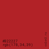 Цвет #B22227 в цветовой модели RGB обозначается тремя октетами (178, 34, 39) в десятичном формате и #B22227 в шестнадцатиричном (hex) формате, которые являются интенсивностью красного 178 (hex B2), интенсивность зелёного 34 (hex 22) и интенсивность синего 39 (hex 27).