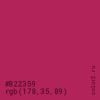 Цвет #B22359 в цветовой модели RGB обозначается тремя октетами (178, 35, 89) в десятичном формате и #B22359 в шестнадцатиричном (hex) формате, которые являются интенсивностью красного 178 (hex B2), интенсивность зелёного 35 (hex 23) и интенсивность синего 89 (hex 59).