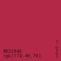 Цвет #B22846 в цветовой модели RGB обозначается тремя октетами (178, 40, 70) в десятичном формате и #B22846 в шестнадцатиричном (hex) формате, которые являются интенсивностью красного 178 (hex B2), интенсивность зелёного 40 (hex 28) и интенсивность синего 70 (hex 46).