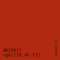 Цвет #B22911 в цветовой модели RGB обозначается тремя октетами (178, 41, 17) в десятичном формате и #B22911 в шестнадцатиричном (hex) формате, которые являются интенсивностью красного 178 (hex B2), интенсивность зелёного 41 (hex 29) и интенсивность синего 17 (hex 11).