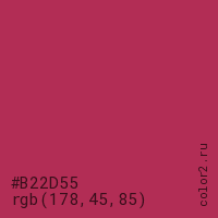 Цвет #B22D55 в цветовой модели RGB обозначается тремя октетами (178, 45, 85) в десятичном формате и #B22D55 в шестнадцатиричном (hex) формате, которые являются интенсивностью красного 178 (hex B2), интенсивность зелёного 45 (hex 2D) и интенсивность синего 85 (hex 55).