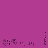 Цвет #B23B91 в цветовой модели RGB обозначается тремя октетами (178, 59, 145) в десятичном формате и #B23B91 в шестнадцатиричном (hex) формате, которые являются интенсивностью красного 178 (hex B2), интенсивность зелёного 59 (hex 3B) и интенсивность синего 145 (hex 91).