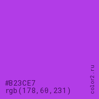 Цвет #B23CE7 в цветовой модели RGB обозначается тремя октетами (178, 60, 231) в десятичном формате и #B23CE7 в шестнадцатиричном (hex) формате, которые являются интенсивностью красного 178 (hex B2), интенсивность зелёного 60 (hex 3C) и интенсивность синего 231 (hex E7).