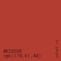 Цвет #B23D30 в цветовой модели RGB обозначается тремя октетами (178, 61, 48) в десятичном формате и #B23D30 в шестнадцатиричном (hex) формате, которые являются интенсивностью красного 178 (hex B2), интенсивность зелёного 61 (hex 3D) и интенсивность синего 48 (hex 30).