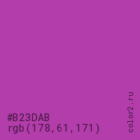 Цвет #B23DAB в цветовой модели RGB обозначается тремя октетами (178, 61, 171) в десятичном формате и #B23DAB в шестнадцатиричном (hex) формате, которые являются интенсивностью красного 178 (hex B2), интенсивность зелёного 61 (hex 3D) и интенсивность синего 171 (hex AB).