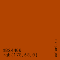 Цвет #B24400 в цветовой модели RGB обозначается тремя октетами (178, 68, 0) в десятичном формате и #B24400 в шестнадцатиричном (hex) формате, которые являются интенсивностью красного 178 (hex B2), интенсивность зелёного 68 (hex 44) и интенсивность синего 0 (hex 00).