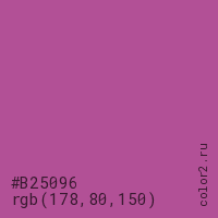 Цвет #B25096 в цветовой модели RGB обозначается тремя октетами (178, 80, 150) в десятичном формате и #B25096 в шестнадцатиричном (hex) формате, которые являются интенсивностью красного 178 (hex B2), интенсивность зелёного 80 (hex 50) и интенсивность синего 150 (hex 96).
