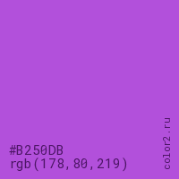 Цвет #B250DB в цветовой модели RGB обозначается тремя октетами (178, 80, 219) в десятичном формате и #B250DB в шестнадцатиричном (hex) формате, которые являются интенсивностью красного 178 (hex B2), интенсивность зелёного 80 (hex 50) и интенсивность синего 219 (hex DB).