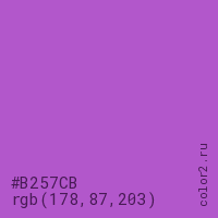 Цвет #B257CB в цветовой модели RGB обозначается тремя октетами (178, 87, 203) в десятичном формате и #B257CB в шестнадцатиричном (hex) формате, которые являются интенсивностью красного 178 (hex B2), интенсивность зелёного 87 (hex 57) и интенсивность синего 203 (hex CB).