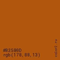 Цвет #B2580D в цветовой модели RGB обозначается тремя октетами (178, 88, 13) в десятичном формате и #B2580D в шестнадцатиричном (hex) формате, которые являются интенсивностью красного 178 (hex B2), интенсивность зелёного 88 (hex 58) и интенсивность синего 13 (hex 0D).