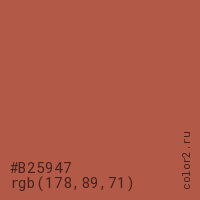Цвет #B25947 в цветовой модели RGB обозначается тремя октетами (178, 89, 71) в десятичном формате и #B25947 в шестнадцатиричном (hex) формате, которые являются интенсивностью красного 178 (hex B2), интенсивность зелёного 89 (hex 59) и интенсивность синего 71 (hex 47).
