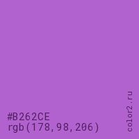 Цвет #B262CE в цветовой модели RGB обозначается тремя октетами (178, 98, 206) в десятичном формате и #B262CE в шестнадцатиричном (hex) формате, которые являются интенсивностью красного 178 (hex B2), интенсивность зелёного 98 (hex 62) и интенсивность синего 206 (hex CE).