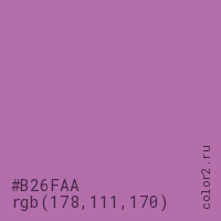 Цвет #B26FAA в цветовой модели RGB обозначается тремя октетами (178, 111, 170) в десятичном формате и #B26FAA в шестнадцатиричном (hex) формате, которые являются интенсивностью красного 178 (hex B2), интенсивность зелёного 111 (hex 6F) и интенсивность синего 170 (hex AA).