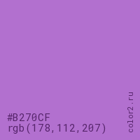 Цвет #B270CF в цветовой модели RGB обозначается тремя октетами (178, 112, 207) в десятичном формате и #B270CF в шестнадцатиричном (hex) формате, которые являются интенсивностью красного 178 (hex B2), интенсивность зелёного 112 (hex 70) и интенсивность синего 207 (hex CF).