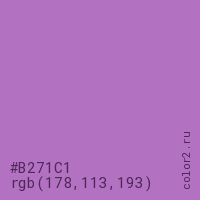 Цвет #B271C1 в цветовой модели RGB обозначается тремя октетами (178, 113, 193) в десятичном формате и #B271C1 в шестнадцатиричном (hex) формате, которые являются интенсивностью красного 178 (hex B2), интенсивность зелёного 113 (hex 71) и интенсивность синего 193 (hex C1).