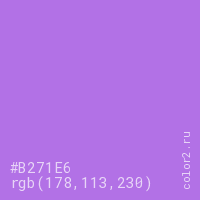 Цвет #B271E6 в цветовой модели RGB обозначается тремя октетами (178, 113, 230) в десятичном формате и #B271E6 в шестнадцатиричном (hex) формате, которые являются интенсивностью красного 178 (hex B2), интенсивность зелёного 113 (hex 71) и интенсивность синего 230 (hex E6).