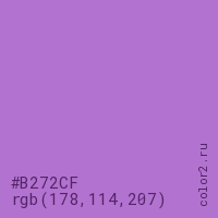 Цвет #B272CF в цветовой модели RGB обозначается тремя октетами (178, 114, 207) в десятичном формате и #B272CF в шестнадцатиричном (hex) формате, которые являются интенсивностью красного 178 (hex B2), интенсивность зелёного 114 (hex 72) и интенсивность синего 207 (hex CF).