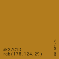 Цвет #B27C1D в цветовой модели RGB обозначается тремя октетами (178, 124, 29) в десятичном формате и #B27C1D в шестнадцатиричном (hex) формате, которые являются интенсивностью красного 178 (hex B2), интенсивность зелёного 124 (hex 7C) и интенсивность синего 29 (hex 1D).