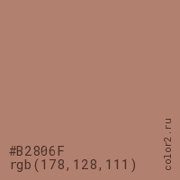 Цвет #B2806F в цветовой модели RGB обозначается тремя октетами (178, 128, 111) в десятичном формате и #B2806F в шестнадцатиричном (hex) формате, которые являются интенсивностью красного 178 (hex B2), интенсивность зелёного 128 (hex 80) и интенсивность синего 111 (hex 6F).