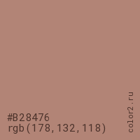 Цвет #B28476 в цветовой модели RGB обозначается тремя октетами (178, 132, 118) в десятичном формате и #B28476 в шестнадцатиричном (hex) формате, которые являются интенсивностью красного 178 (hex B2), интенсивность зелёного 132 (hex 84) и интенсивность синего 118 (hex 76).