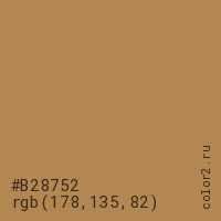 Цвет #B28752 в цветовой модели RGB обозначается тремя октетами (178, 135, 82) в десятичном формате и #B28752 в шестнадцатиричном (hex) формате, которые являются интенсивностью красного 178 (hex B2), интенсивность зелёного 135 (hex 87) и интенсивность синего 82 (hex 52).
