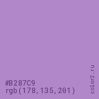 Цвет #B287C9 в цветовой модели RGB обозначается тремя октетами (178, 135, 201) в десятичном формате и #B287C9 в шестнадцатиричном (hex) формате, которые являются интенсивностью красного 178 (hex B2), интенсивность зелёного 135 (hex 87) и интенсивность синего 201 (hex C9).