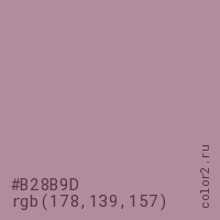 Цвет #B28B9D в цветовой модели RGB обозначается тремя октетами (178, 139, 157) в десятичном формате и #B28B9D в шестнадцатиричном (hex) формате, которые являются интенсивностью красного 178 (hex B2), интенсивность зелёного 139 (hex 8B) и интенсивность синего 157 (hex 9D).
