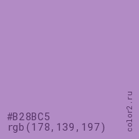Цвет #B28BC5 в цветовой модели RGB обозначается тремя октетами (178, 139, 197) в десятичном формате и #B28BC5 в шестнадцатиричном (hex) формате, которые являются интенсивностью красного 178 (hex B2), интенсивность зелёного 139 (hex 8B) и интенсивность синего 197 (hex C5).