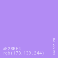 Цвет #B28BF4 в цветовой модели RGB обозначается тремя октетами (178, 139, 244) в десятичном формате и #B28BF4 в шестнадцатиричном (hex) формате, которые являются интенсивностью красного 178 (hex B2), интенсивность зелёного 139 (hex 8B) и интенсивность синего 244 (hex F4).