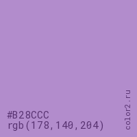 Цвет #B28CCC в цветовой модели RGB обозначается тремя октетами (178, 140, 204) в десятичном формате и #B28CCC в шестнадцатиричном (hex) формате, которые являются интенсивностью красного 178 (hex B2), интенсивность зелёного 140 (hex 8C) и интенсивность синего 204 (hex CC).