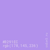Цвет #B291EC в цветовой модели RGB обозначается тремя октетами (178, 145, 236) в десятичном формате и #B291EC в шестнадцатиричном (hex) формате, которые являются интенсивностью красного 178 (hex B2), интенсивность зелёного 145 (hex 91) и интенсивность синего 236 (hex EC).