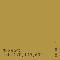 Цвет #B29545 в цветовой модели RGB обозначается тремя октетами (178, 149, 69) в десятичном формате и #B29545 в шестнадцатиричном (hex) формате, которые являются интенсивностью красного 178 (hex B2), интенсивность зелёного 149 (hex 95) и интенсивность синего 69 (hex 45).