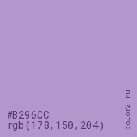 Цвет #B296CC в цветовой модели RGB обозначается тремя октетами (178, 150, 204) в десятичном формате и #B296CC в шестнадцатиричном (hex) формате, которые являются интенсивностью красного 178 (hex B2), интенсивность зелёного 150 (hex 96) и интенсивность синего 204 (hex CC).