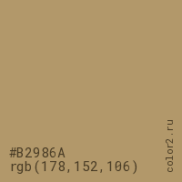 Цвет #B2986A в цветовой модели RGB обозначается тремя октетами (178, 152, 106) в десятичном формате и #B2986A в шестнадцатиричном (hex) формате, которые являются интенсивностью красного 178 (hex B2), интенсивность зелёного 152 (hex 98) и интенсивность синего 106 (hex 6A).
