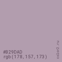 Цвет #B29DAD в цветовой модели RGB обозначается тремя октетами (178, 157, 173) в десятичном формате и #B29DAD в шестнадцатиричном (hex) формате, которые являются интенсивностью красного 178 (hex B2), интенсивность зелёного 157 (hex 9D) и интенсивность синего 173 (hex AD).