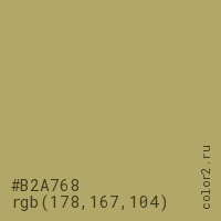 Цвет #B2A768 в цветовой модели RGB обозначается тремя октетами (178, 167, 104) в десятичном формате и #B2A768 в шестнадцатиричном (hex) формате, которые являются интенсивностью красного 178 (hex B2), интенсивность зелёного 167 (hex A7) и интенсивность синего 104 (hex 68).