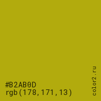 Цвет #B2AB0D в цветовой модели RGB обозначается тремя октетами (178, 171, 13) в десятичном формате и #B2AB0D в шестнадцатиричном (hex) формате, которые являются интенсивностью красного 178 (hex B2), интенсивность зелёного 171 (hex AB) и интенсивность синего 13 (hex 0D).