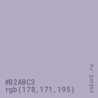 Цвет #B2ABC3 в цветовой модели RGB обозначается тремя октетами (178, 171, 195) в десятичном формате и #B2ABC3 в шестнадцатиричном (hex) формате, которые являются интенсивностью красного 178 (hex B2), интенсивность зелёного 171 (hex AB) и интенсивность синего 195 (hex C3).