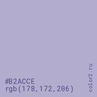 Цвет #B2ACCE в цветовой модели RGB обозначается тремя октетами (178, 172, 206) в десятичном формате и #B2ACCE в шестнадцатиричном (hex) формате, которые являются интенсивностью красного 178 (hex B2), интенсивность зелёного 172 (hex AC) и интенсивность синего 206 (hex CE).