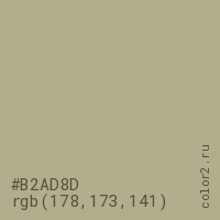 Цвет #B2AD8D в цветовой модели RGB обозначается тремя октетами (178, 173, 141) в десятичном формате и #B2AD8D в шестнадцатиричном (hex) формате, которые являются интенсивностью красного 178 (hex B2), интенсивность зелёного 173 (hex AD) и интенсивность синего 141 (hex 8D).