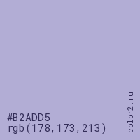 Цвет #B2ADD5 в цветовой модели RGB обозначается тремя октетами (178, 173, 213) в десятичном формате и #B2ADD5 в шестнадцатиричном (hex) формате, которые являются интенсивностью красного 178 (hex B2), интенсивность зелёного 173 (hex AD) и интенсивность синего 213 (hex D5).