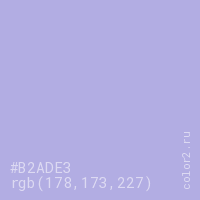 Цвет #B2ADE3 в цветовой модели RGB обозначается тремя октетами (178, 173, 227) в десятичном формате и #B2ADE3 в шестнадцатиричном (hex) формате, которые являются интенсивностью красного 178 (hex B2), интенсивность зелёного 173 (hex AD) и интенсивность синего 227 (hex E3).