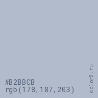 Цвет #B2BBCB в цветовой модели RGB обозначается тремя октетами (178, 187, 203) в десятичном формате и #B2BBCB в шестнадцатиричном (hex) формате, которые являются интенсивностью красного 178 (hex B2), интенсивность зелёного 187 (hex BB) и интенсивность синего 203 (hex CB).